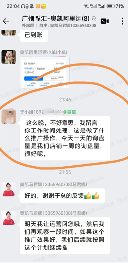 深夜广州于小姐群里发来表扬:“今天阿里一天的咨询量相当于原一周的,很好呢”,看了客户的反馈,我们运营小单也相当高兴。