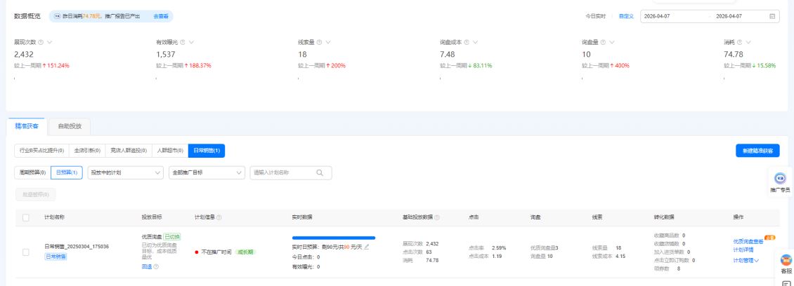 1:广告计划调整,上周刚把店铺的计划数据导出调整了一下,因为从数据看基本上下午点击成本少,客户也更精准,所以精准获客的推广时间也调整集中在下午,也就是说刚好有客户在找我们排名也靠前,导致询盘激增。