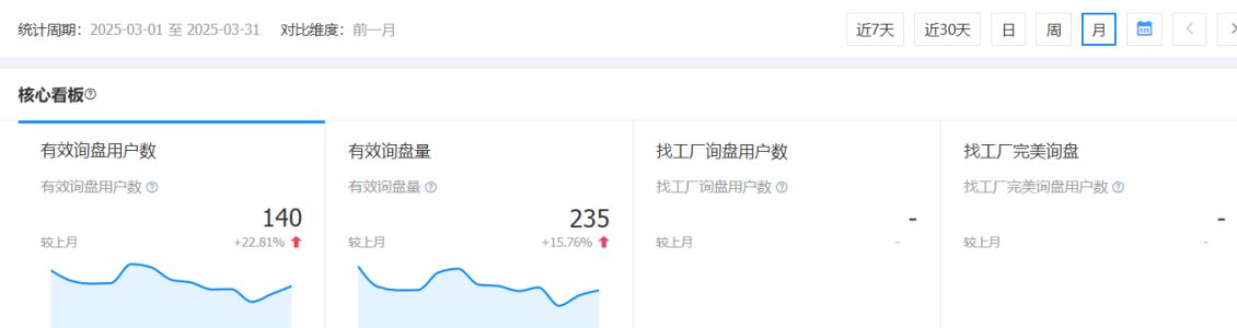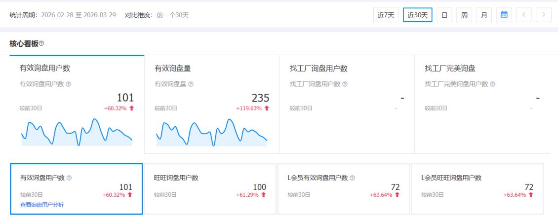 先给大家看两张1688运营的后台截图。上边这张,是客户自己花钱开广告时的询盘数据;下边这张,是我们接手运营之后、一分钱广告都没开的询盘数据。